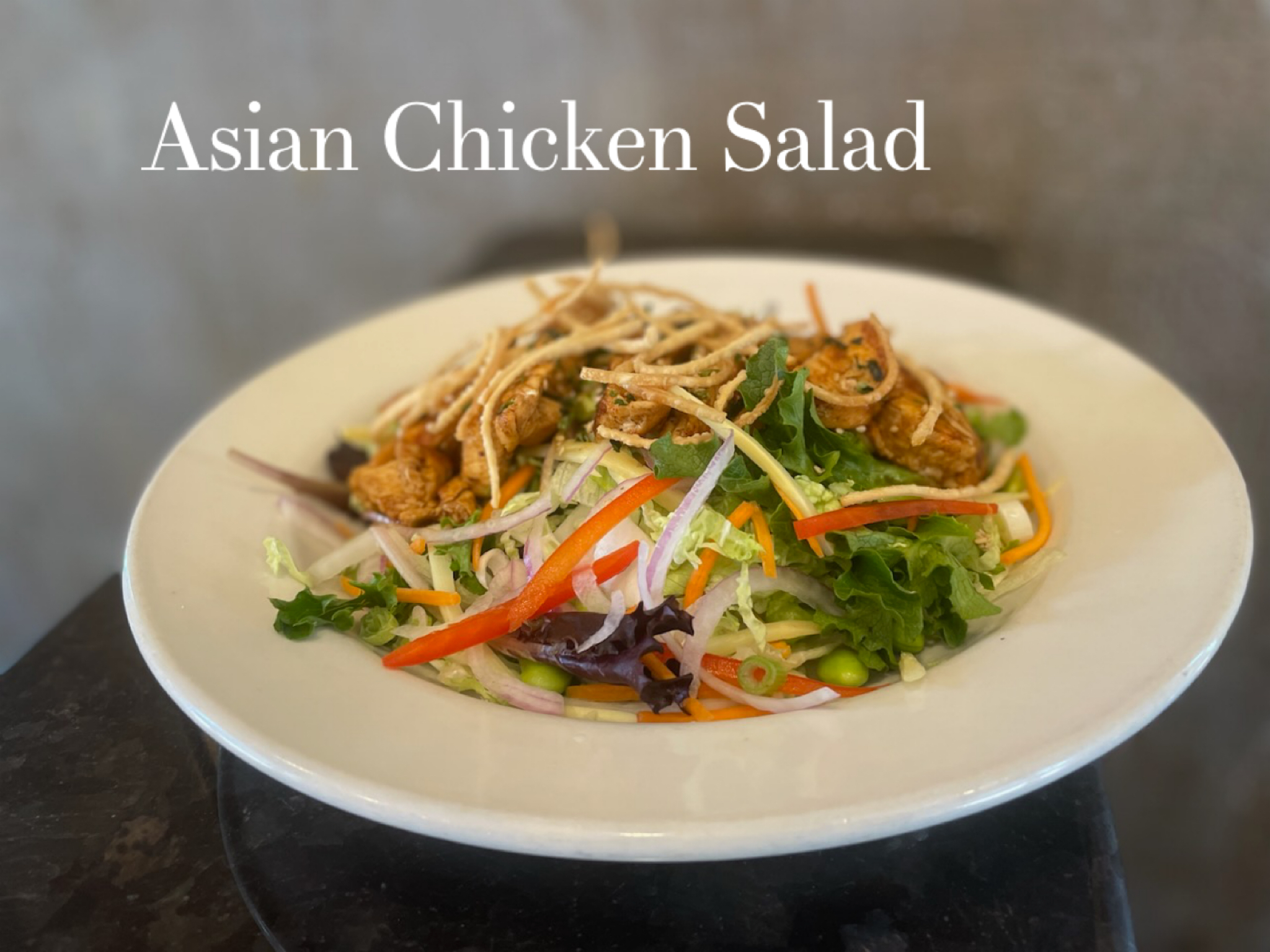 Marinated Chicken breast seasoned and grilled, set on top of mixed greens with napa cabbage, edamame, bamboo shoots tossed in our house made Asian vinaigrette and finished with fried wonton strips