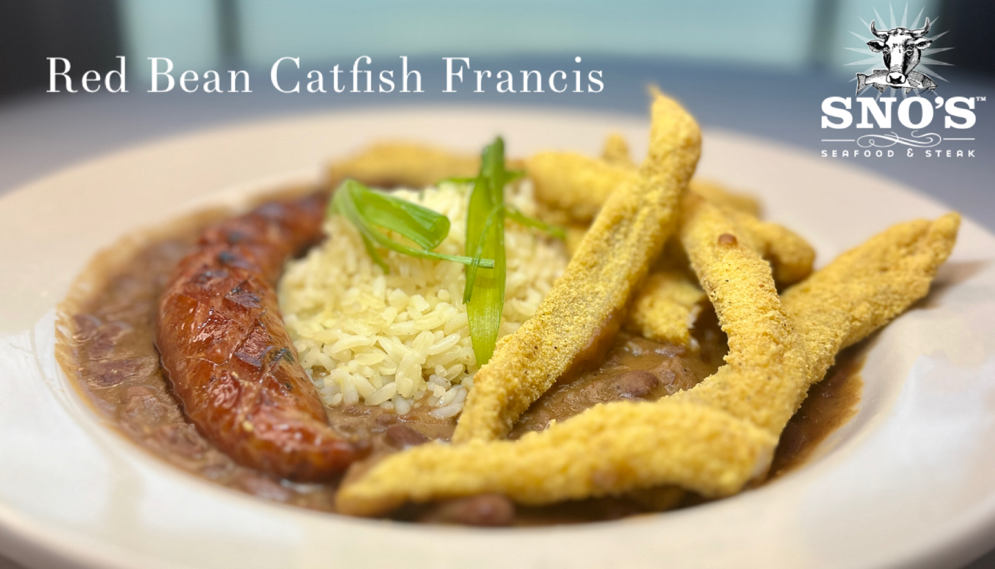 Red beans, slow cooked with smoked sausage, served over rice and topped with golden fried catfish strips