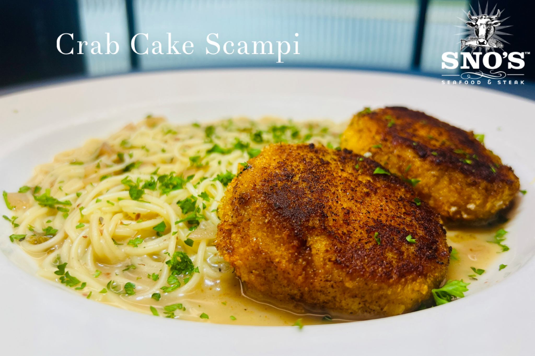 Homemade crab cakes dusted with seasoning then grilled and served over angel hair pasta tossed in a “scampi” sauce