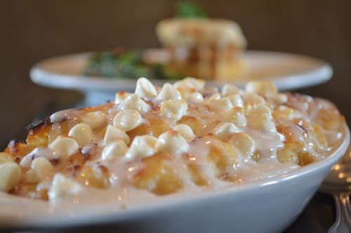 A southern favorite, made with New Orleans French bread mixed with a decadent white chocolate custard, served warm topped with white chocolate chips.