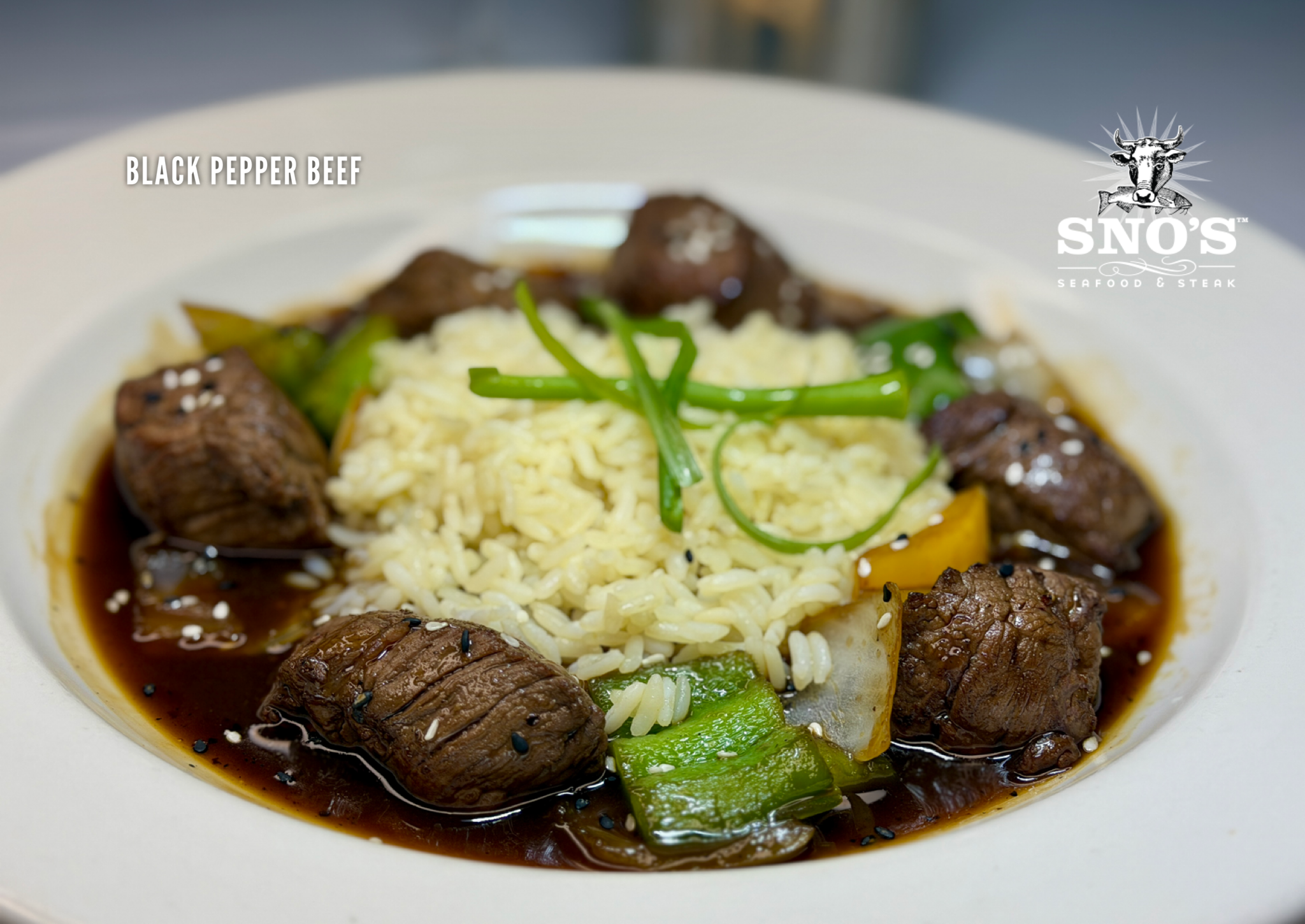 Tender beef tenderloin sautéed with onions and peppers in a rich Asian soy glaze, served over steamed white rice.