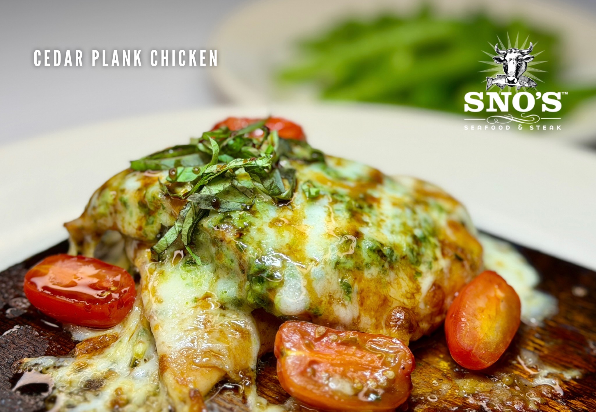 Cedar-plank roasted chicken breast, seared and finished in the oven, topped with basil pesto, fresh tomatoes, and melted mozzarella, then drizzled with a rich balsamic reduction. Served with fresh green beans..