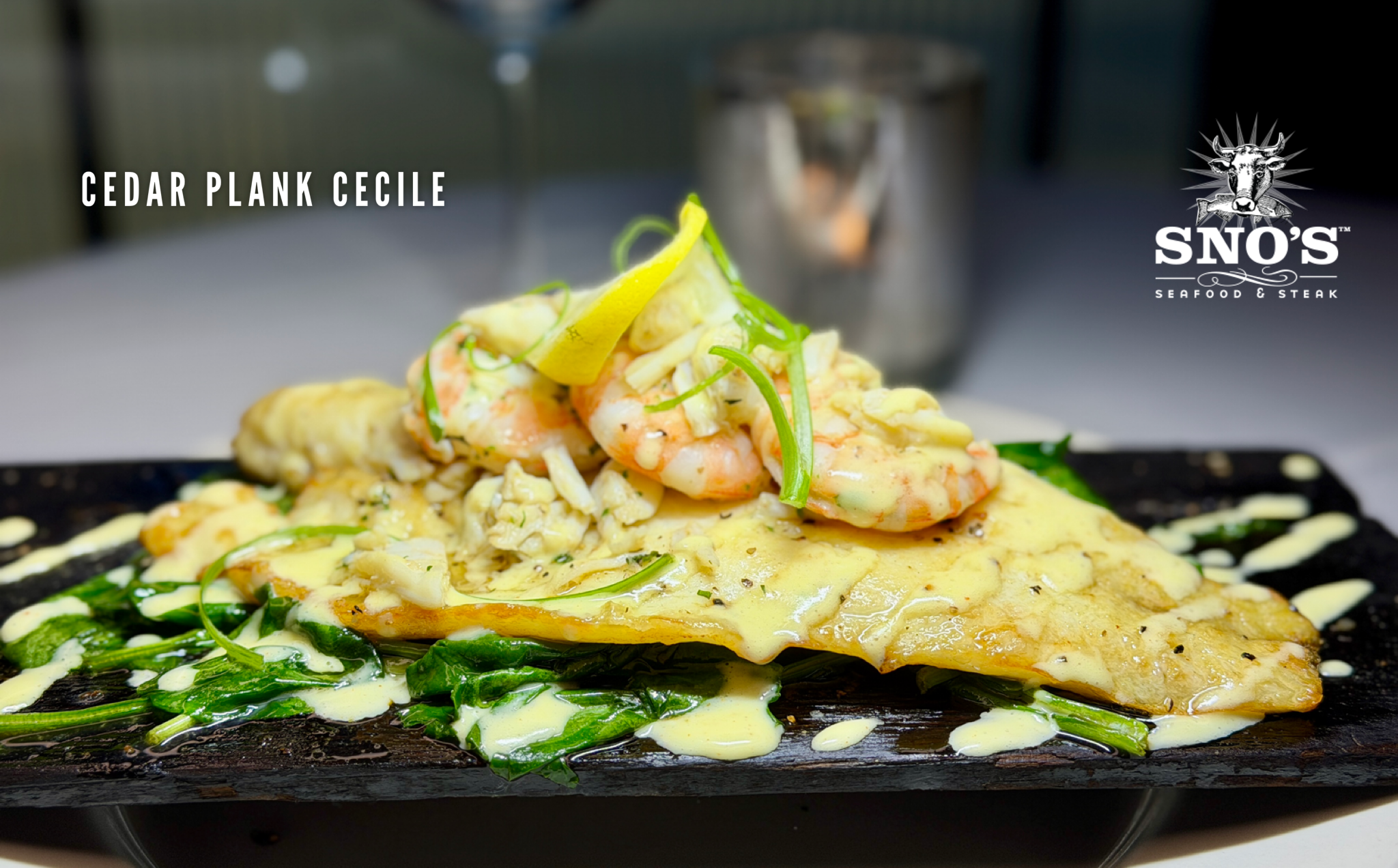 Fresh speckled trout, roasted on a cedar plank, served over wilted spinach then topped with Gulf shrimp, lump crabmeat and a drizzle of hollandaise sauce Choice of soup du jour or salad